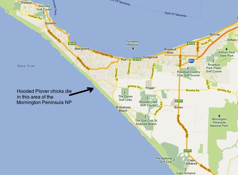 At least two, recently hatched Hooded Plover chicks, have disappeared from a beach at Rye in the Mornington Peninsula National Park. They are most likely dead.