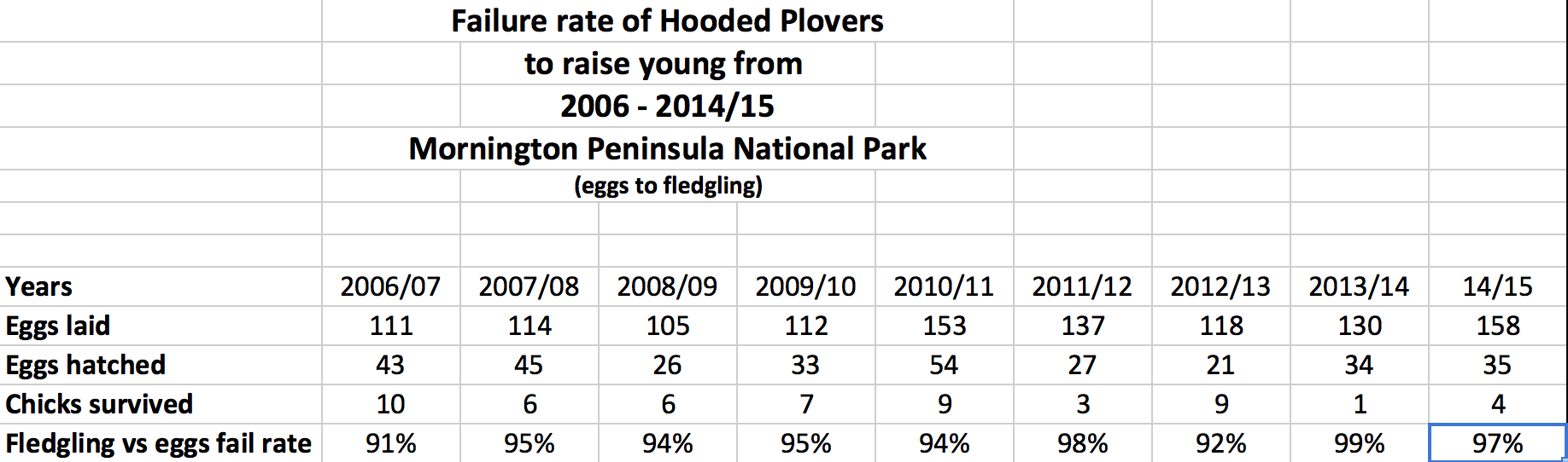 Each Hooded Plover breeding season in the Mornington Peninsula National Park, volunteers, Parks Victoria and BirdLife Australia staff closely monitor nesting, egg laying, hatching of eggs and fledging of chicks in the National Park. In the last five years, the average rate of failure for each egg laid has been calculated as 96% (see Figure 2). Clearly this rate of failure to reproduce for a population of threatened shorebird is not sustainable and explains why the National Park’s Hooded Plover population is in decline.