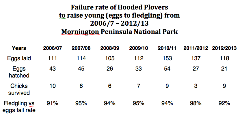 After years of counting Hooded Plovers, recording their breeding outcomes, and the behaviour of visitors in the Mornington Peninsula National Park, long term scientifically based monitoring clearly indicates a number of important and disappointing facts in relation to Hooded Plover conservation in the Mornington Peninsula National Park: